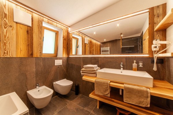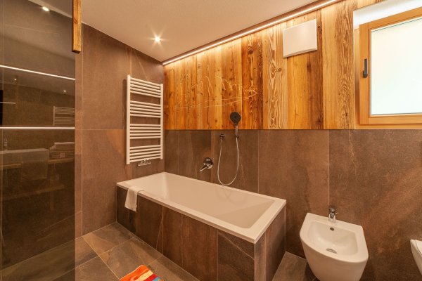 - Grande bagno con vasca da bagno, doccia, bidet, WC, scalda asciugamani e phon.